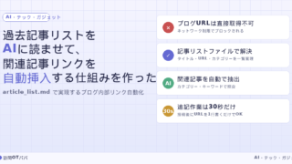 ブログの関連記事リンクをAIに自動挿入してもらう仕組みを構築しました。article_list.mdを使った運用方法と、自動化できる部分・手動が必要な部分の整理について実体験をもとに紹介します。