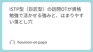 ISTP型(巨匠型)の訪問OTが、資格勉強における強み(短期集中・論理思考)と落とし穴(システム構築への逃避・書類の後回し)を自分の経験をもとに整理しました。