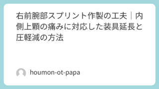 訪問OTが右前腕部スプリント作製で直面した、内側上顆の疼痛への対応策を記録。装具の延長・クッション材の活用・皮膚管理のポイントをわかりやすく解説します。