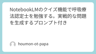 NotebookLMのクイズ機能に入れるべきプロンプトを紹介。5肢択一・計算問題・禁忌事項を含む実戦的クイズを生成し、呼吸療法認定士試験対策に活用する方法を解説。