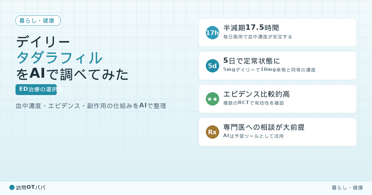 ED治療は「恥ずかしいから調べにくい」と感じる方も多いかもしれません。ですが医療職として言えば、これは立派な健康管理のひとつです。AIを活用して調べることで、薬の仕組み・血中濃度の推移・エビデンスの強さ・副作用のメカニズムを、自分のペースで体系的に理解できました。