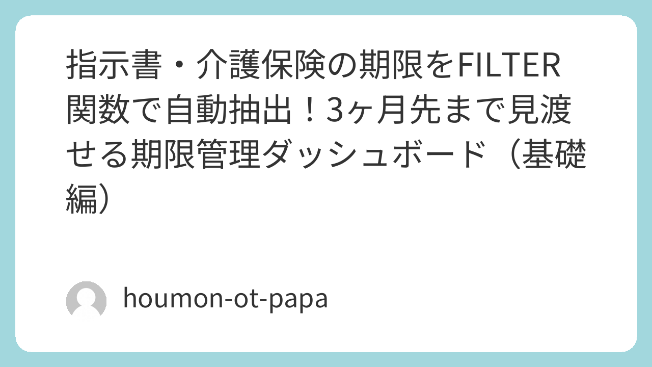 指示書・介護保険の期限をFILTER関数で自動抽出!3ヶ月先まで見渡せる期限管理ダッシュボード(基礎編)