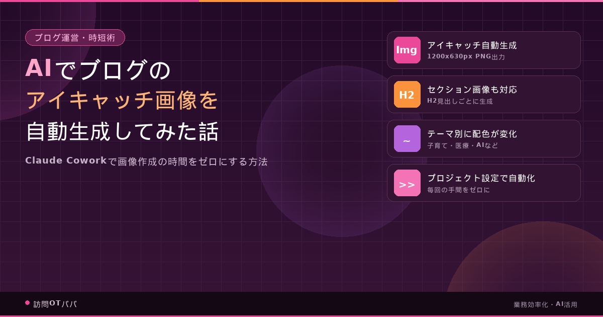 重要なのは、テーマに応じて配色が自動的に変わるという点です。AI関連の記事なら紫青系、子育て記事なら暖色系と、記事の内容から連想されるカラーパレットをAIが判断してくれます。