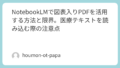 また、NotebookLMはPDF内の数値や上付き・下付き文字(PaO₂の「a」など)を誤認することがあります。クイズの「正解」として示された数値がテキストと異なっていないか、気になった問題は必ず原典に戻って確認する習慣をつけてください。